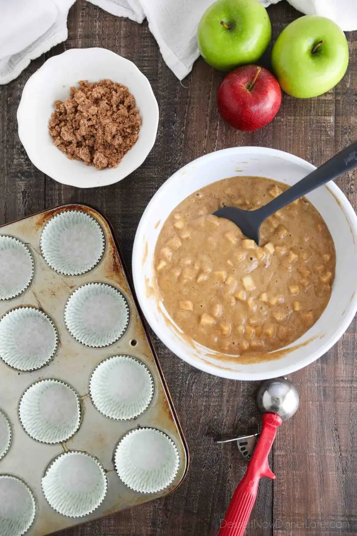 Then sprinkle with the prepared streusel before placing the pan of apple crumb muffins in the oven.