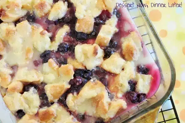 - In a greased 13×9″ pan, layer half of the soaked bread cubes, then top that with all of the blueberries, & lastly, dollop the remaining half of the soaked bread crumbs.