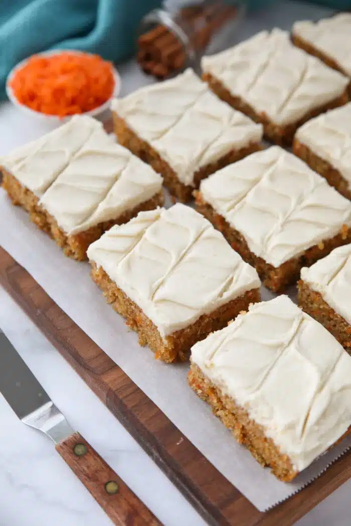 - TO SERVE: Cut carrot cake bars into 15 pieces (3 rows by 5 rows). Then use a serving spatula to lift the bars out of the pan.
