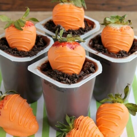 “Carrot” Easter Pudding Cups – These fun pudding cups are perfect for Spring and Easter with an orange candy dipped strawberry “carrot” in crushed Oreo and chocolate pudding “dirt.”