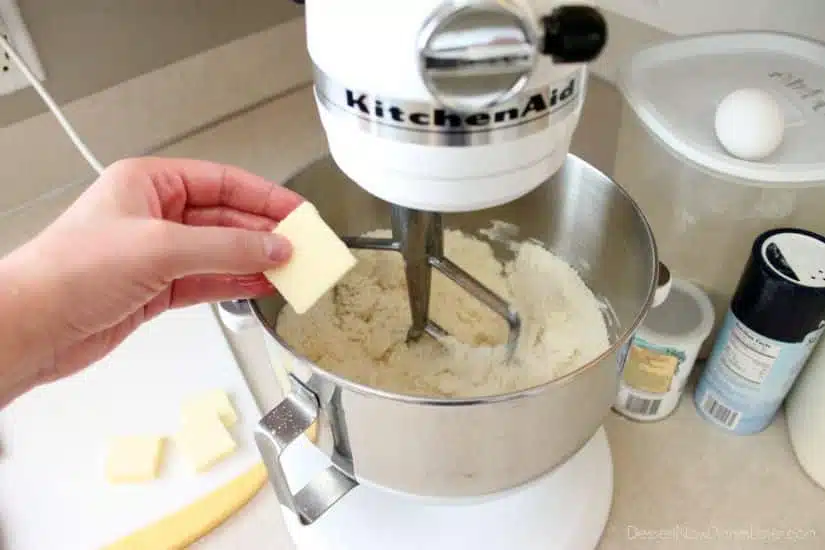Add 1 cup (2 sticks) of cold butter one Tablespoon at a time, while the mixer is running, until the mixture resembles fine crumbs.