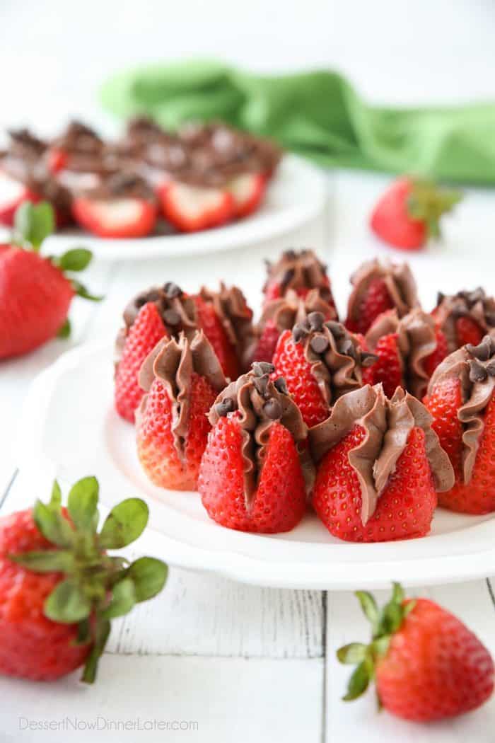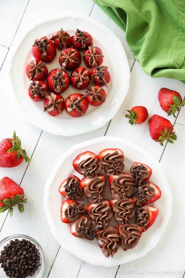 It’s only fitting (and way overdue) that I created a chocolate variation. These are the same cheesecake stuffed strawberries, flavored with cocoa powder to make them chocolatey. Top them with mini chocolate chips for extra decadence.