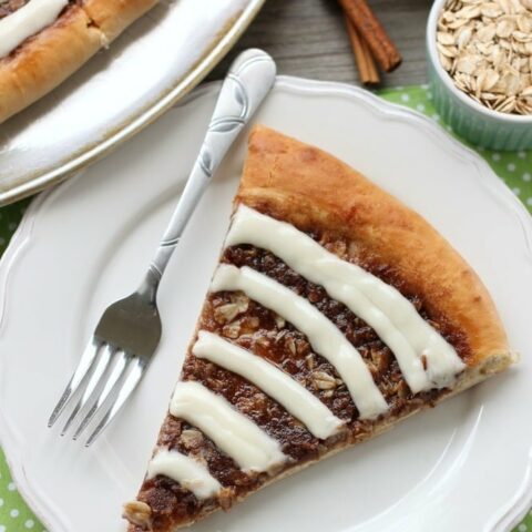 This Cinnamon Roll Dessert Pizza is an amazing copycat version of Papa Murphy’s Cinnamon Wheel, with brown sugar, cinnamon, and oats, topped with a tangy cream cheese icing.