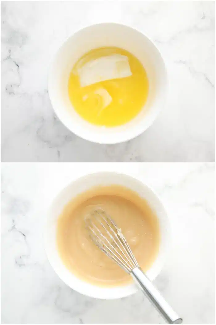 • Melt the butter and cream cheese together in heat-safe bowl in the microwave. Add the powdered sugar and vanilla and whisk until smooth.