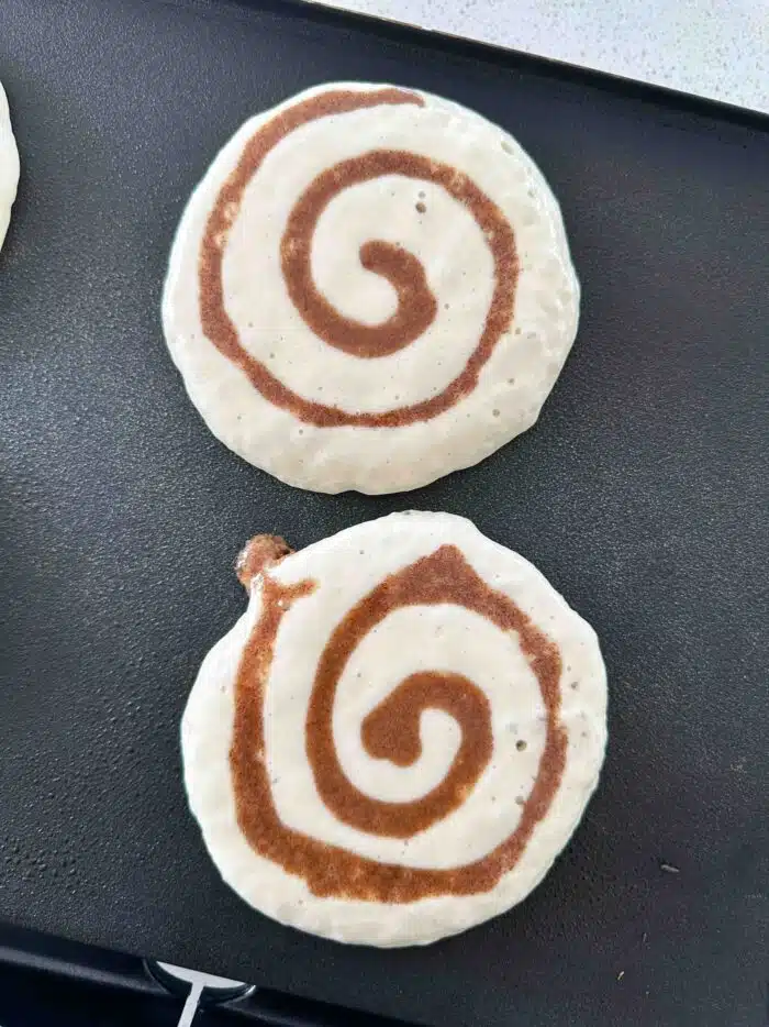 1. Make the cinnamon roll pancakes: Heat griddle to 325˚F. Grease with cooking spray. Make pancakes with ¼ cup of batter each, leaving space between each pancake so they don’t stick together.