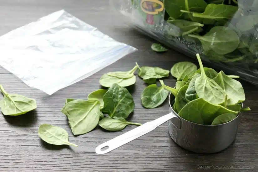 - In a zip-top sandwich bag, add the spinach, banana pieces, frozen yogurt cubes, and mixed frozen fruit. Squeeze out the air and zip the bag shut. Place in freezer. Repeat for additional packs.