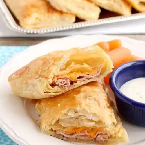 When I worked in a bakery, we made more than just the sweet stuff. We would make these easy Ham and Cheese Pockets (or Turkey and Swiss Pockets) for catered events and things. We actually used danish dough instead of puff pastry, but it’s easier to find the puff pastry in regular grocery stores and it’s so flakey good!