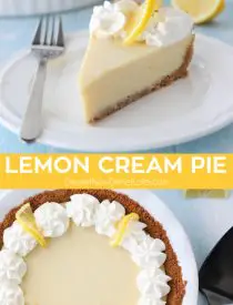 Lemon Cream Pie is tangy and sweet with a buttery graham cracker crust. It’s just like key lime pie, but made with lemons, and topped with fresh sweetened whipped cream. A super easy spring or summer dessert, and great alternative to lemon meringue pie.