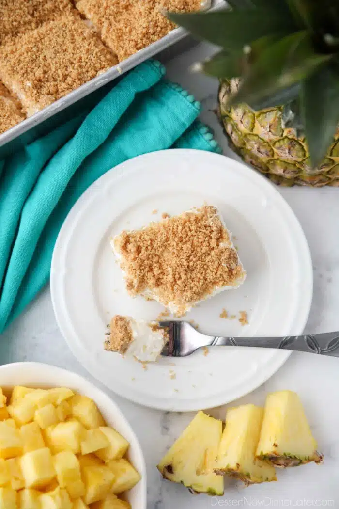 Pineapple Delight is a layered dessert made with graham crackers, cream cheese, pineapple, and whipped topping. (Or you can make your own homemade Cool Whip.) Also known as Pineapple Dream Dessert or Pineapple Lush, this creamy tropical dessert can be made completely no-bake and is perfect for spring or summer potlucks.