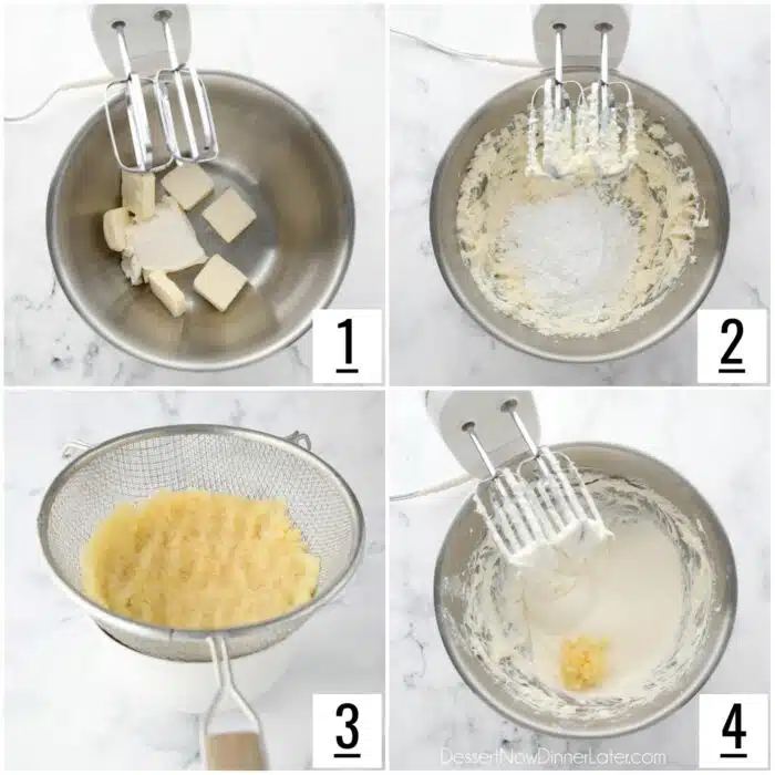 - Place the cream cheese and butter in a large bowl. Beat together with an electric hand mixer until smooth and creamy.