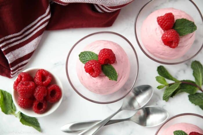 - Spoon, pour, or pipe the raspberry mousse into six individual serving dishes. Top with raspberries and mint, if desired. (NOTE: If you’ve piped a dome like I did, and add the garnish after it’s chilled, it won’t stick as well.)