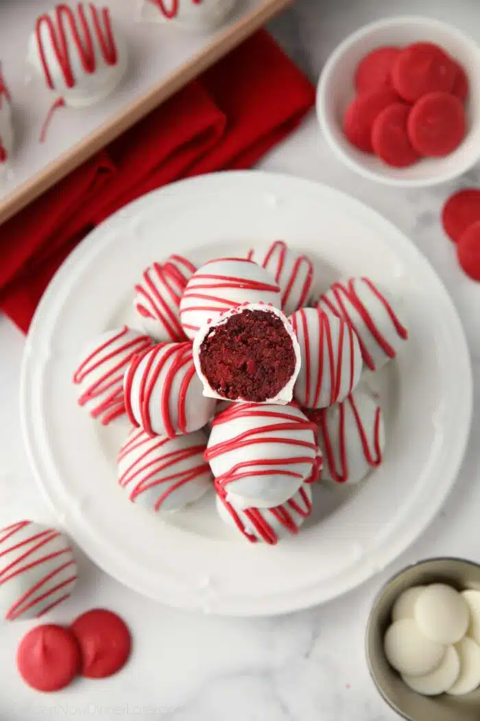 These red velvet truffles (aka red velvet cake pops without the stick) are great for Christmas parties and neighbor plates or as a romantic treat for your sweetheart on Valentine’s Day.