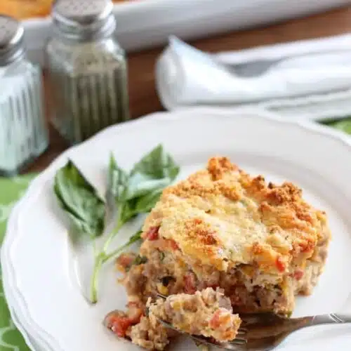 It’s basically a breakfast casserole, with bread, that you don’t even notice is in there really. It just helps things absorb and gel together as a casserole should.