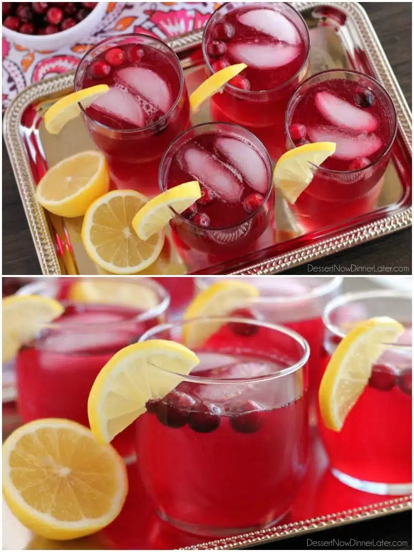 - Serve drinks with ice, cranberries, and lemon wedges.