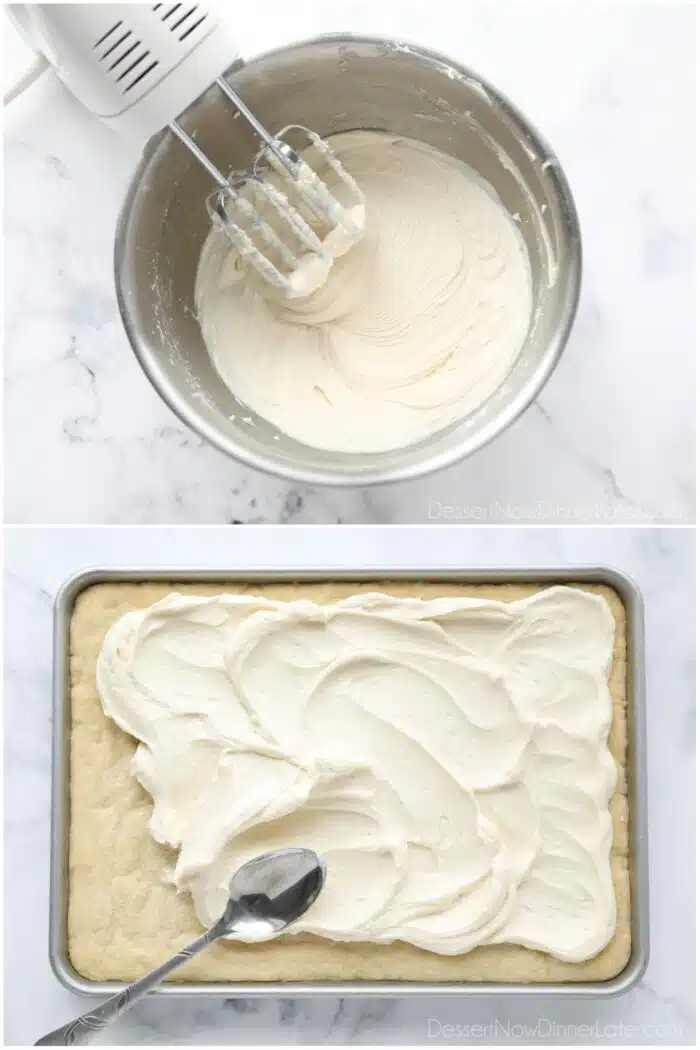 - Make the cream cheese frosting. Spread it evenly on top of the cooled sugar cookie bars.
