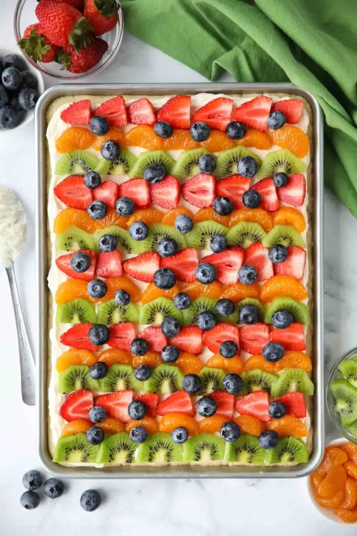 - Even Slices: Unlike a round pizza with triangular slices, using a rectangular pan makes it easy to cut even pieces. And every piece is sure to have some of every type of fruit.