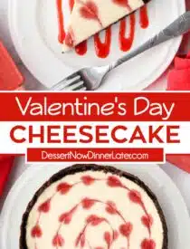 Heart shaped swirls in this Valentine’s Day Cheesecake are easy to make and beautiful to look at. This delicious valentines dessert is sure to impress your special someone.